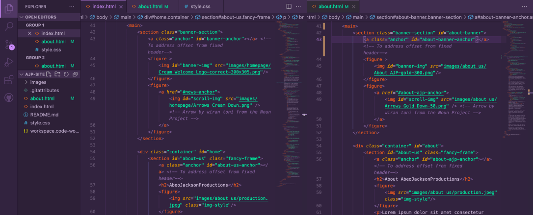 Today I built the “About Us” page, complete with a different banner, images and bio received from client. I also adjusted the header width ot accommodate the new nav link, as it threw my placement off too much, and added a little bit of styling to indicate which page is being visited.