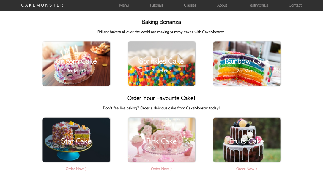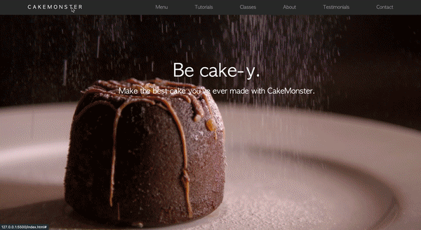 Today’s biggest challenge came with the overlapping text and images in the new section. I knew I’d be doing essentially what I did yesterday to create the banner (which consists of an image on top of a video), but it took a little bit to figure out exactly how to structure it without breaking the flexbox positioning. Once I did, I spent the rest of the time tweaking to bring it more into alignment with the source site, from deciding how many cake pictures to include to adding the necessary hover effects.