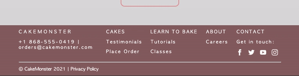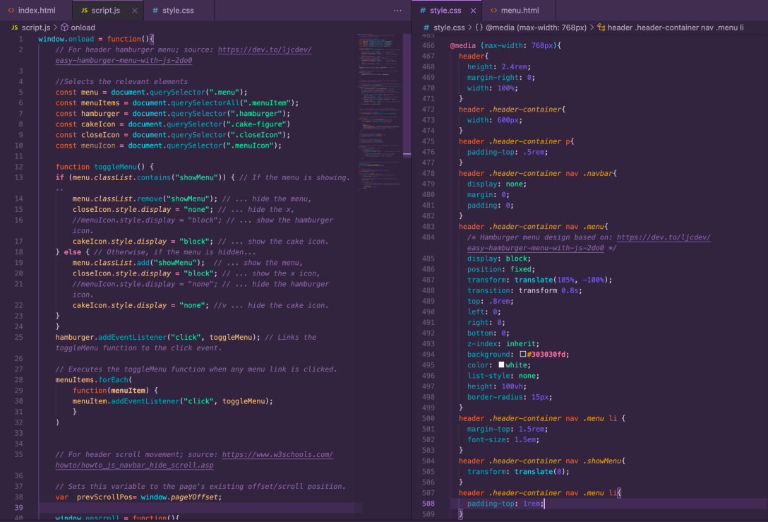 The hamburger menu is based on this article from dev.to, which was a great way to refresh myself on event listeners. The icons’ fixed positioning broke my responsiveness so I had to make some tweaks, but it came out great. Once I had it nailed down, I pulled a cake icon from iconmonstr.com because who puts a hamburger menu on a cake site?
