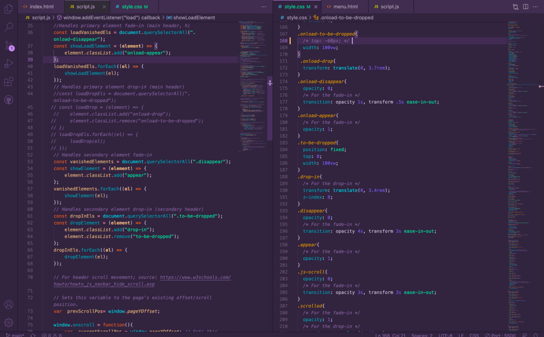 I spent a ridiculous amount of time trying to figure out how to separately fade and drop in my dual headers onload. I almost had it all before I had to call it a day. I got as far as arranging the two separate fade-ins and setting the secondary header to slide down slowly, but when I tried to make the primary header slide down, it broke the pre-existing header scrolling function (that’s the one that makes the header slide up as I scroll down and back down when I scroll up).